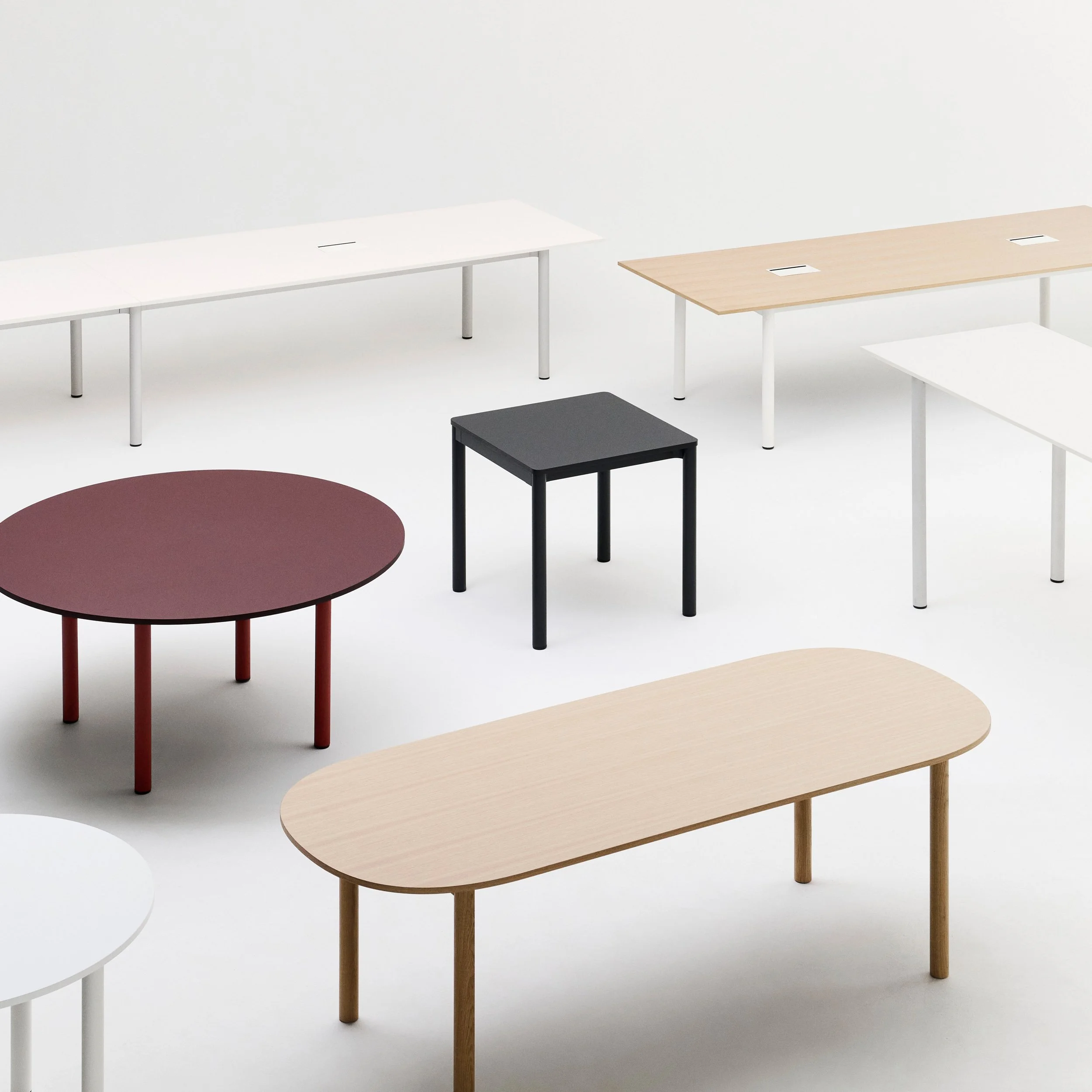 Built on a strong, economical, and flexible connection between leg and surface there are three families. Round, square, and a more modular family with rounded corners that follows the frame below.